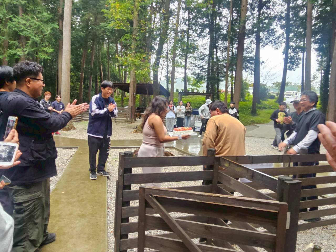 少し間が空いてしまいましたが…先日のBBQでは、翌日お誕生日を迎えられる社長へのサプライズお祝いを行いました!社員一同でこっそり準備を進め、タイミングを見計らってふくろうの森のオーナー様にお持ちいただきましてケーキが登場!